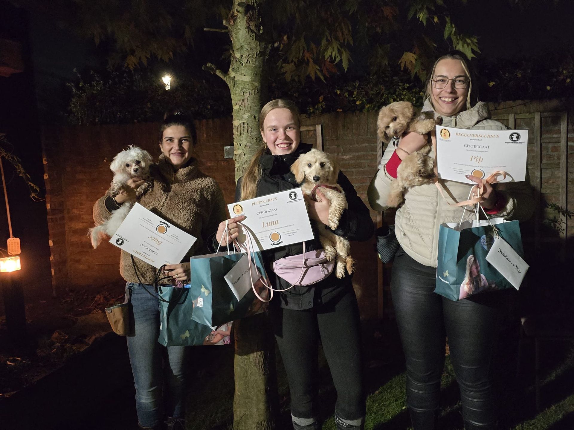 Tijdens deze extra les vol plezier voeren jullie verschillende oefeningen uit, van basiscommando’s tot wat uitdagendere opdrachten. Na afloop ontvangen jullie een certificaat als bewijs van jullie inzet en groei. Deelnemers uit de puppycursus en beginnerscursus krijgen daarnaast een goed gevulde Goody Bag mee naar huis als extra beloning. Voor de basisvervolgcursus is er ook een verrassende extraatje, wat dat is... die houd ik nog even geheim!